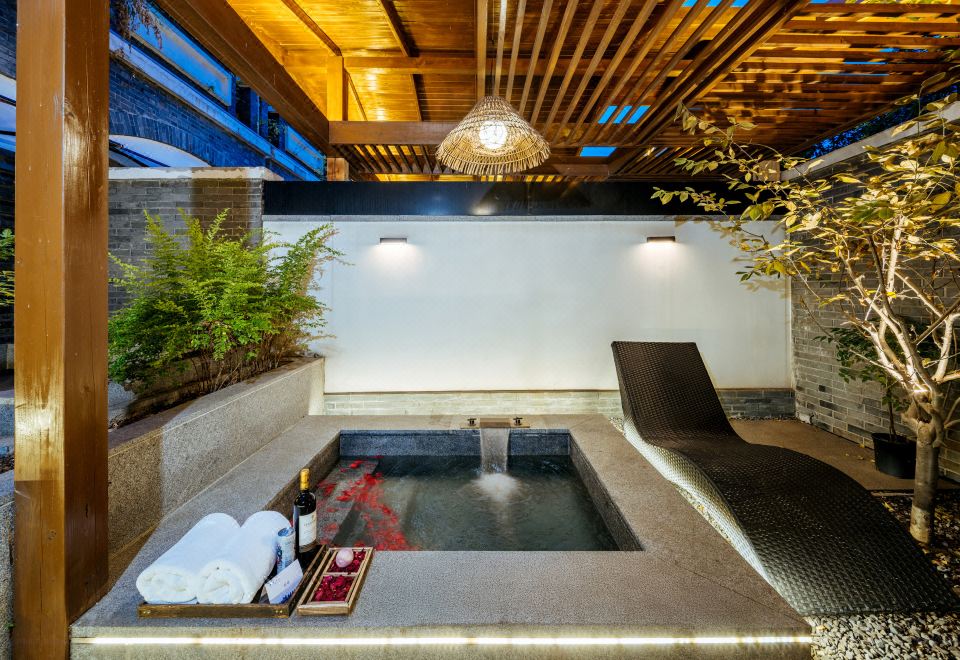 河畔私湯庭院大床房「65寸投屏電視+獨立庭院+精油浴球」